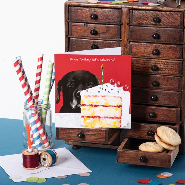 In need of a cheerful, brightly coloured Black Labrador birthday card ? If so, this design offering may well fit the bill.