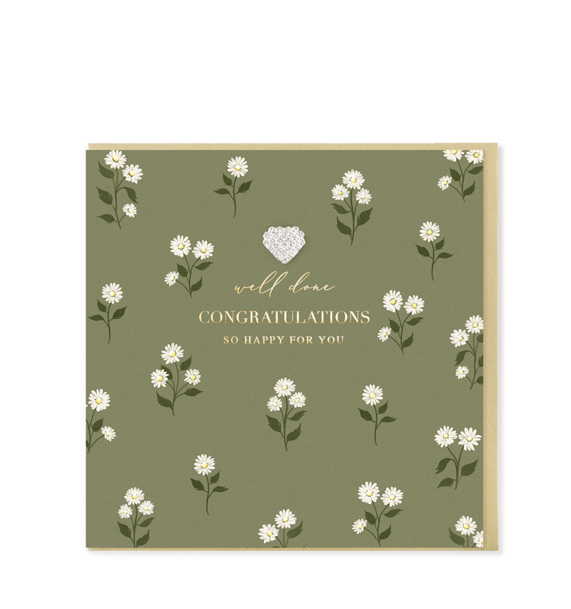 A luxury greetings card with gold foil detailing. Hand embellished with a diamanté heart jewel. This card has been printed on FSC board. Presented with a pearlescent gold envelope and cello wrapped. Blank inside.