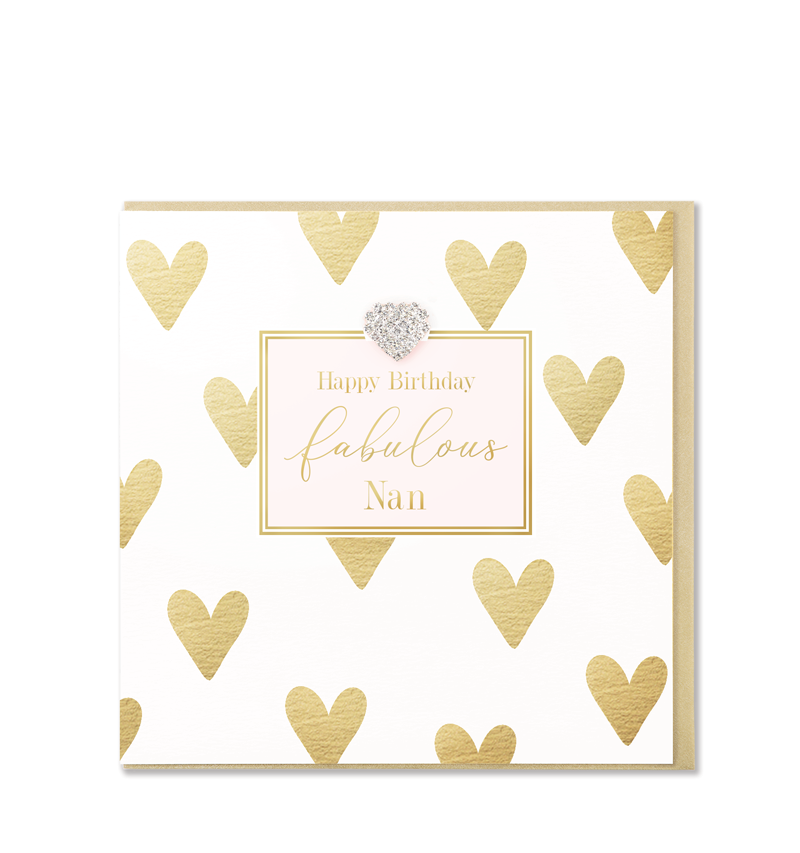 Gorgeous luxury greetings card with Gold foil sentiment and hand embellished with a diamanté heart jewel. This card is printed on luxury FSC board and presented with a pearlescent Gold envelope and cello wrapped. Blank inside.