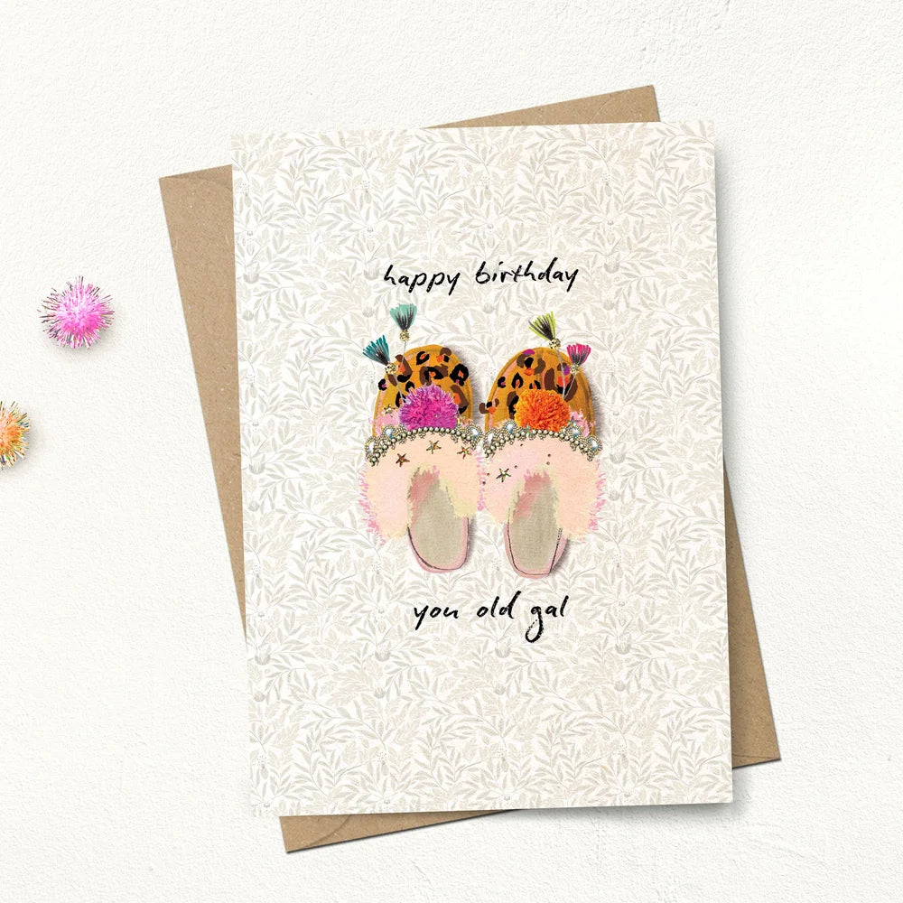 features a pair of painted decorated slippers with the caption ‘Happy Birthday You Old Gal’. Hand stamped with eco-friendly foil.
