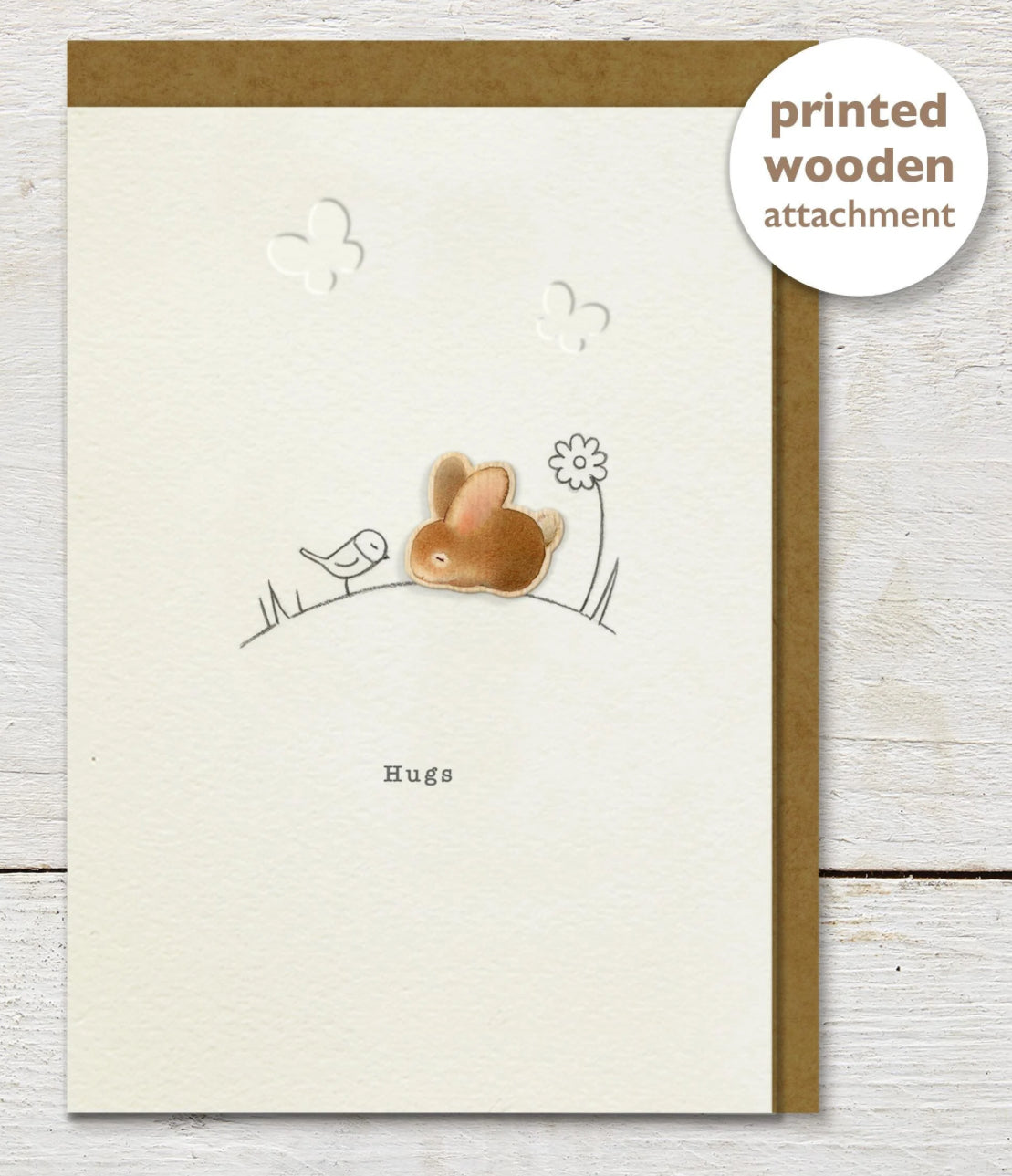 Greetings card featuring a printed wooden cut out bunny attachment feature and debossed flowers. Card also has delicately debossed hearts, and a fleck kraft envelope.