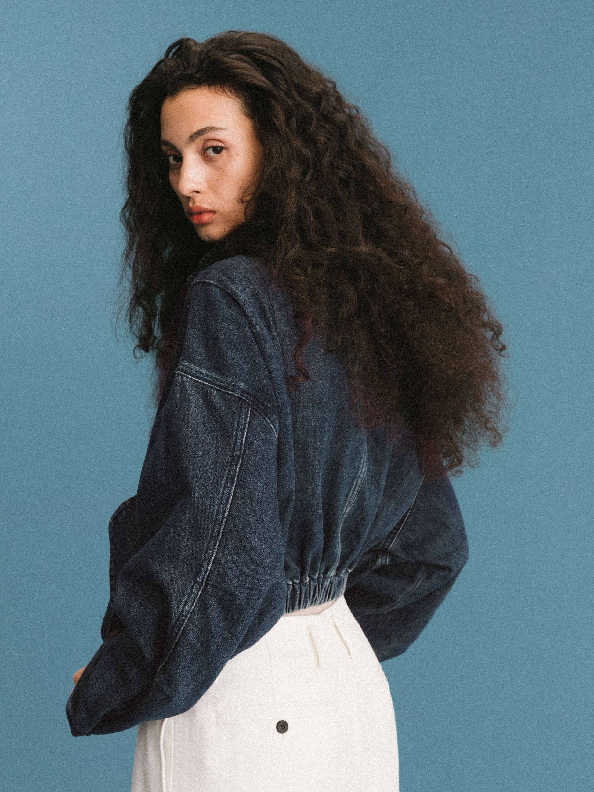 Short denim jacket in steelblue from ONE BY CUBIC collection. Oversize model, funnel neck, long sleeves and front zip and fly fastener. Two flap pockets and elastic hemline. The fabric composition is 82% Cotton 18% Polyester. Model wears size UN, which is suitable for UK size 8-12. Product Code: TOBDC6203