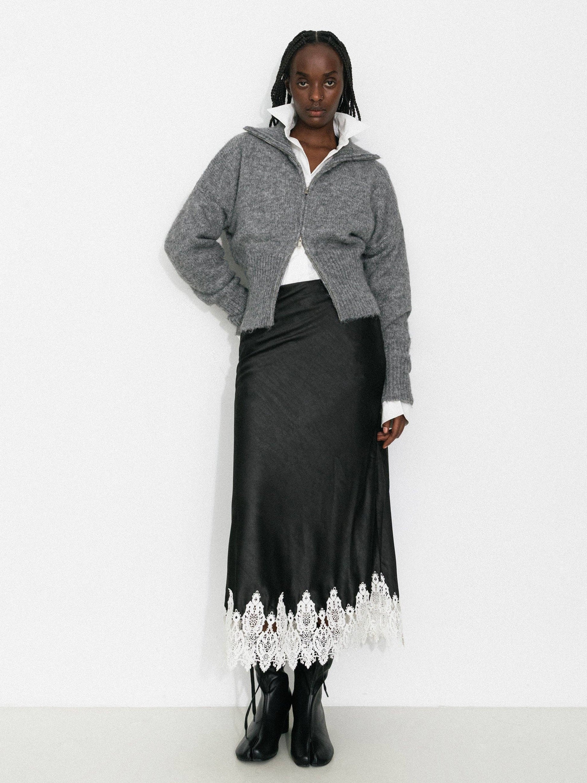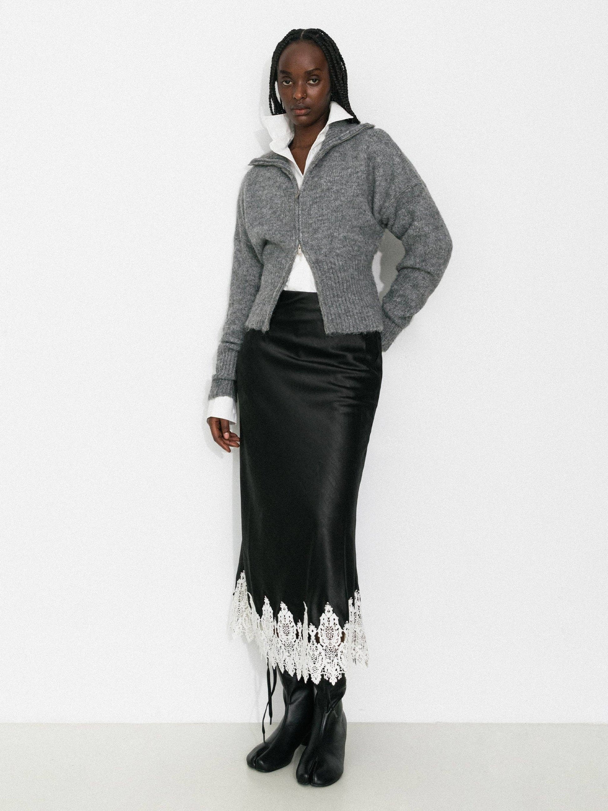 The ribbed hem hugs the waist with gentle elasticity, highlighting your silhouette, and the textured contrast between the ribbing and the alpaca-blend fabric adds refined detail to the cardigan. Fabric Composition: 53% Acrylic, 18% Nylon, 18% Polyester, 10% Wool, 1% Spandex.
