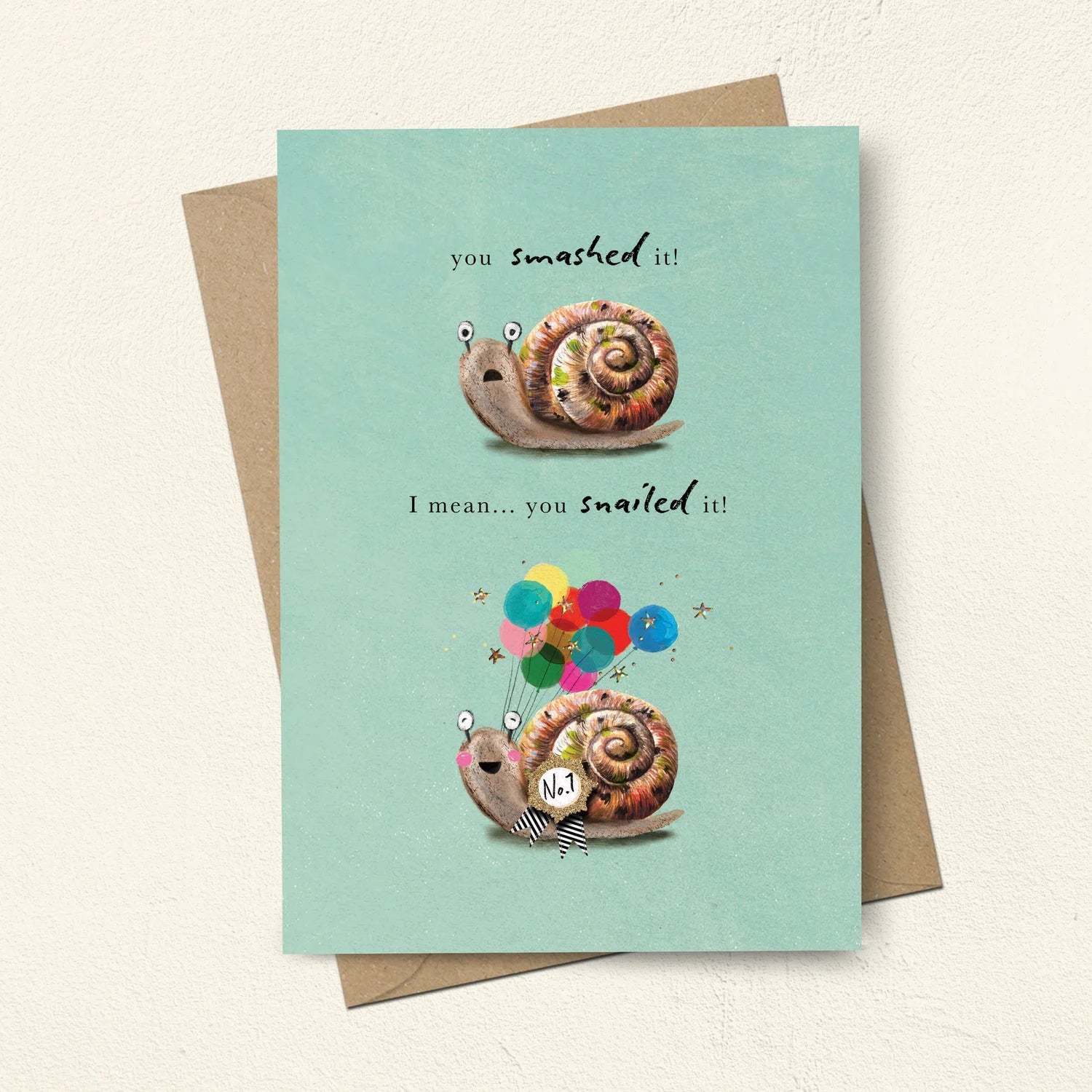 this greetings card features a snail and balloons with the caption ‘You smashed it! I mean…you snailed it!’. Hand stamped with eco-friendly foil.