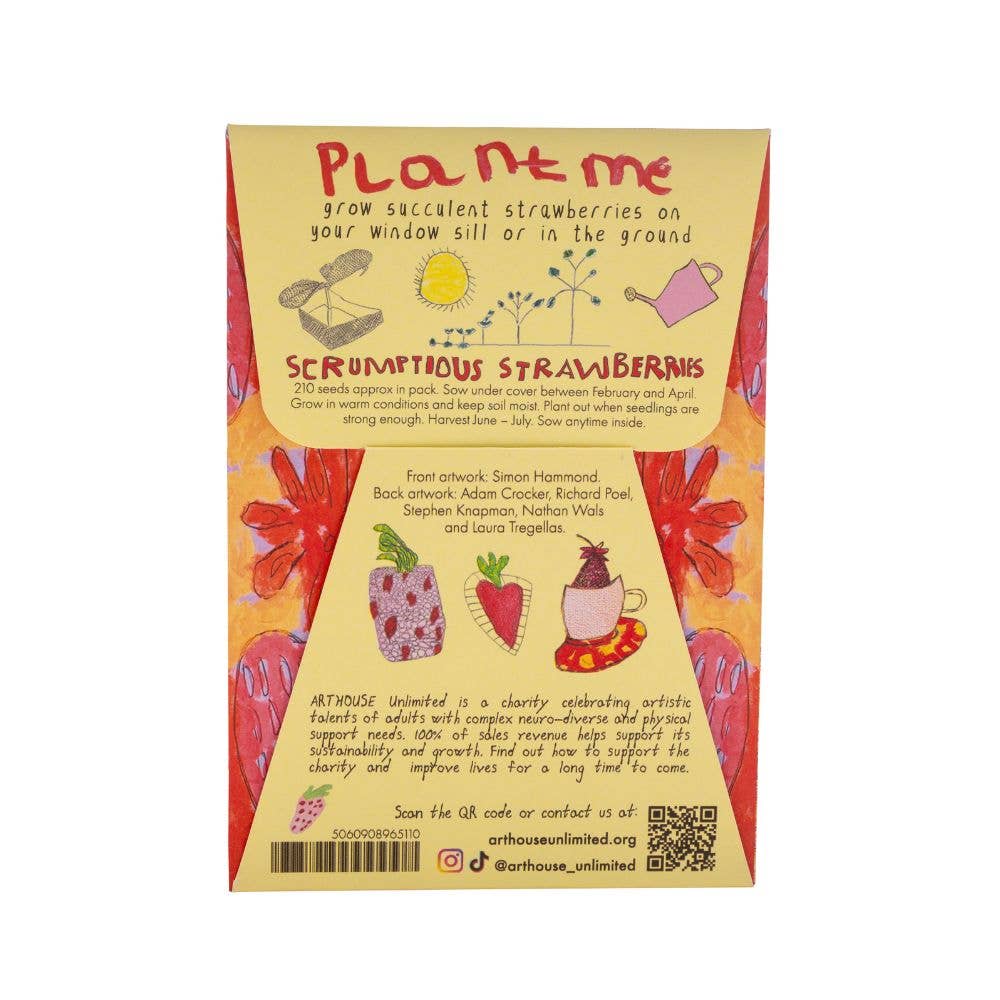 Enjoy home grown strawberries this Summer with these succulent strawberry seeds. The creative and colourful seed packet features collaborative artwork by the ARTHOUSE Unlimited artists, including front artwork by Simon Hammond.