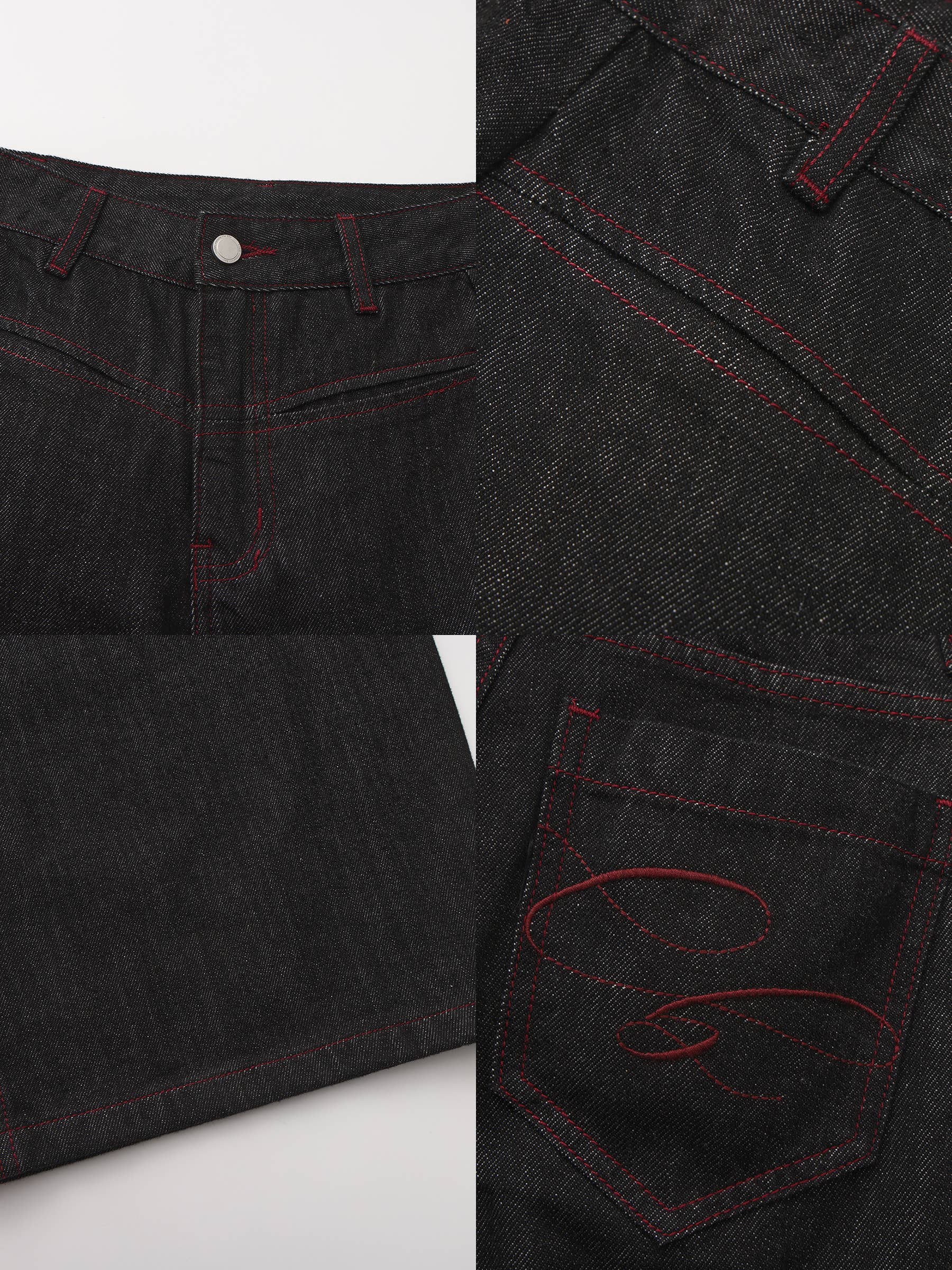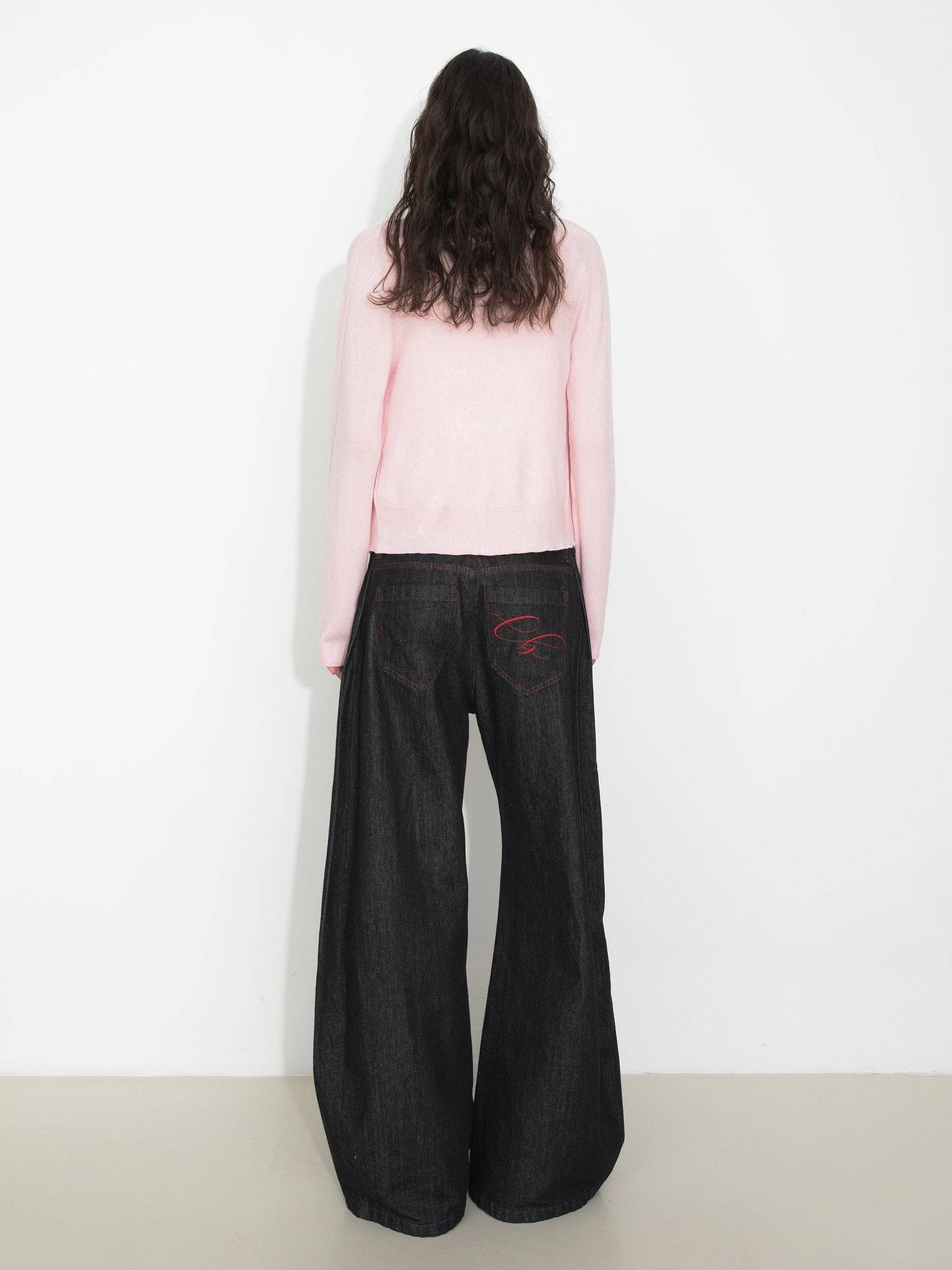 Vintage curved wide-leg trousers in navy. Designed with a mid-low rise and subtle curved-leg silhouette for a relaxed yet structured look. The waistband sits naturally on the hips, while the soft inward taper and outward flare create a fluid, scimitar-inspired line. Combines vintage attitude with modern edge. The fabric composition is 85% cotton, 10% polyester, 5% regenerated cellulose. Model wears size L, which is suitable for UK size 12. Product Code: COBEP2003