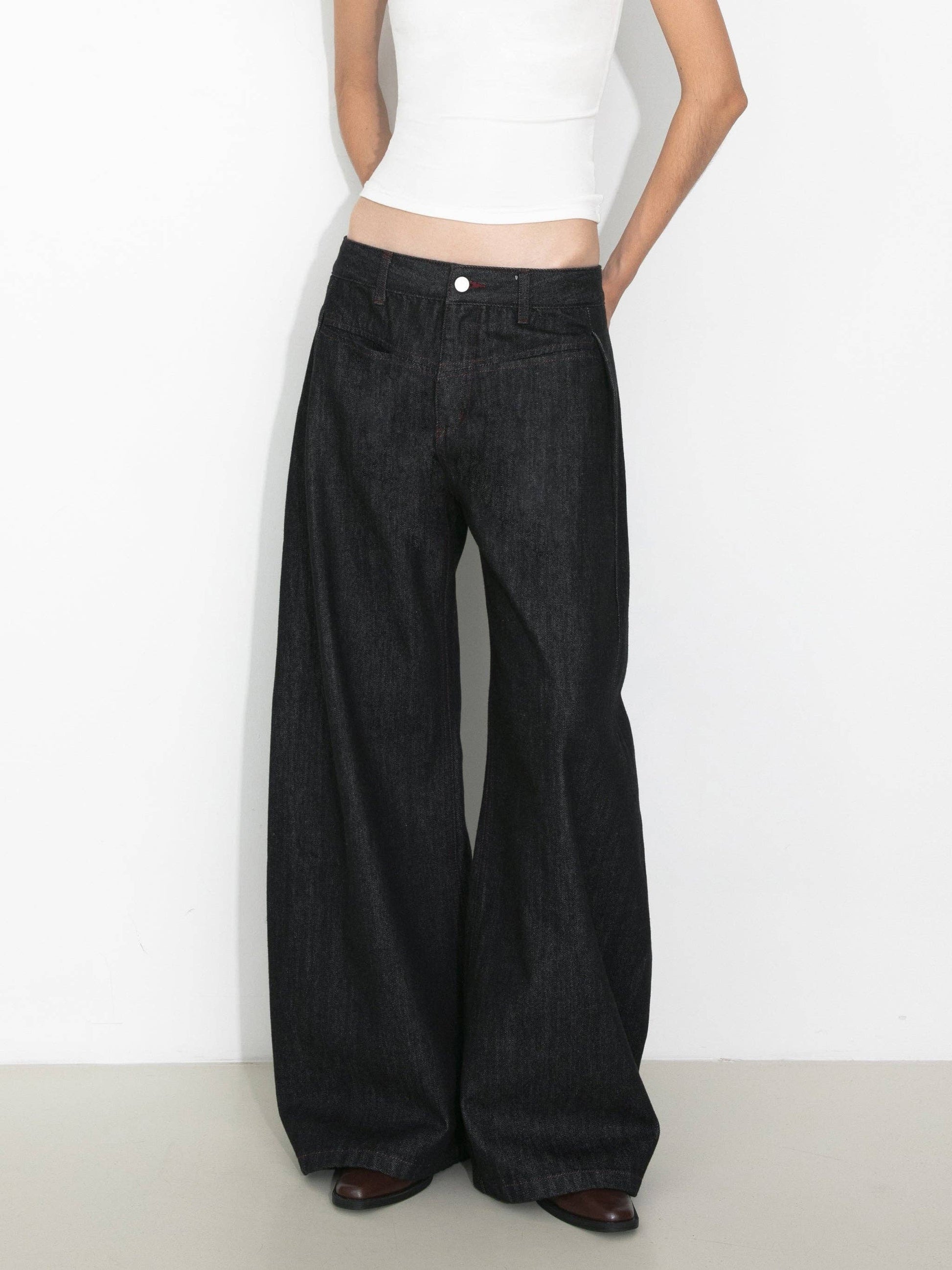 Vintage Curved Wide-Leg Trousers: Navy / M