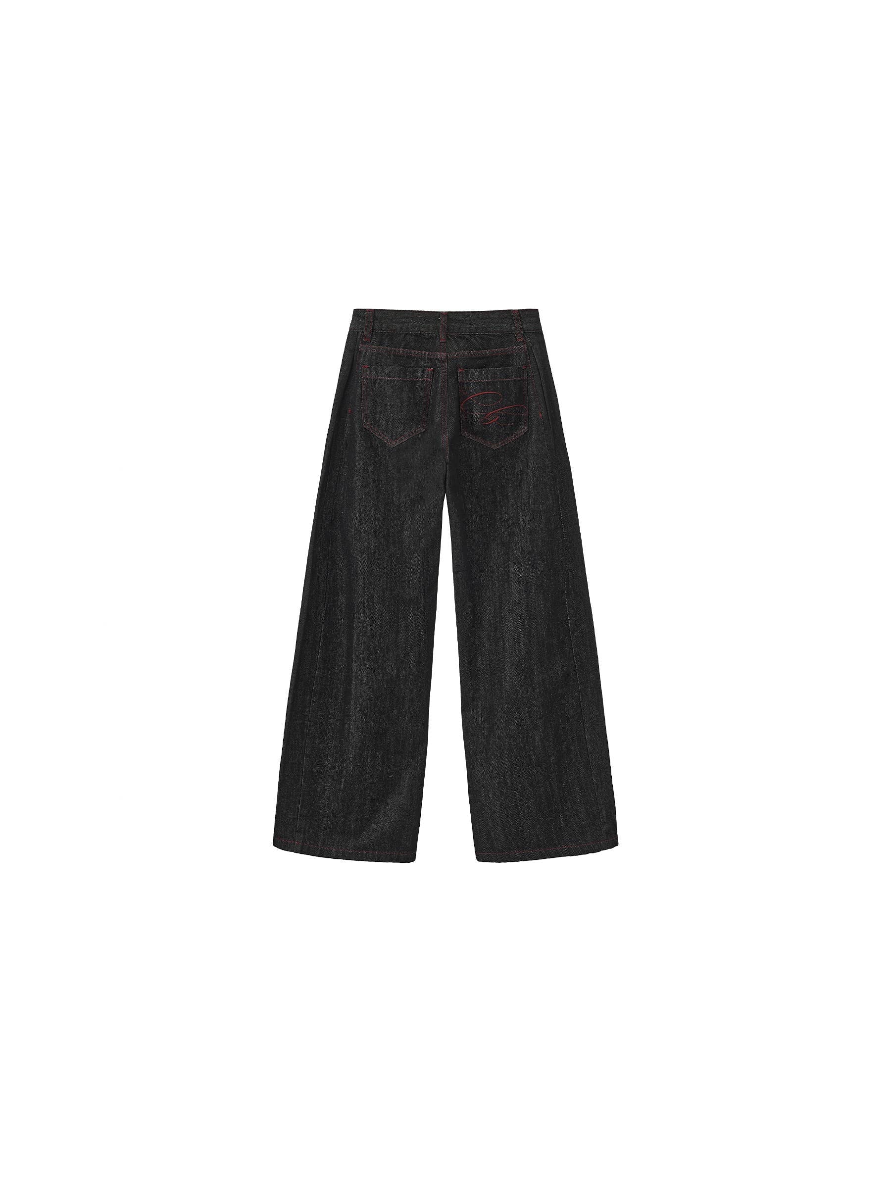 Vintage curved wide-leg trousers in navy. Designed with a mid-low rise and subtle curved-leg silhouette for a relaxed yet structured look. The waistband sits naturally on the hips, while the soft inward taper and outward flare create a fluid, scimitar-inspired line. Combines vintage attitude with modern edge. The fabric composition is 85% cotton, 10% polyester, 5% regenerated cellulose. Model wears size L, which is suitable for UK size 12. Product Code: COBEP2003